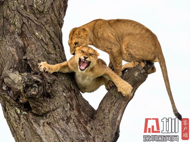 攝影師抓拍獅子上樹(shù)畫(huà)面 為爭(zhēng)奪位置憤怒咆哮互相攻擊