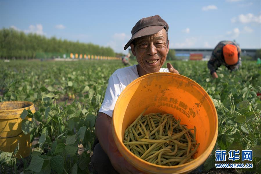 7月14日,在克東縣昌盛鄉(xiāng)青刀豆蔬菜種植示范基地,昌盛鄉(xiāng)安全村脫貧戶(hù)丁紹興展示剛摘下的青刀豆。黑龍江省克東縣地處大興安嶺南麓,近年來(lái),當(dāng)?shù)卮罅Πl(fā)展扶貧產(chǎn)業(yè),探索“小院經(jīng)濟(jì)”、訂單種植和加工產(chǎn)業(yè)相融合新方式,帶動(dòng)農(nóng)民就業(yè)和脫貧增收。新華社記者 王建威 攝