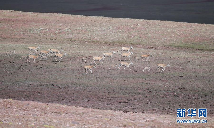 7月7日在可可西里卓乃湖區(qū)域拍攝的藏羚羊。目前正值藏羚羊產(chǎn)仔季。來自青海三江源、新疆阿爾金山、西藏羌塘等地的藏羚羊來到位于青海省可可西里腹地、被譽(yù)為“藏羚羊大產(chǎn)房”的卓乃湖區(qū)域產(chǎn)仔。新華社記者 薛玉斌 攝