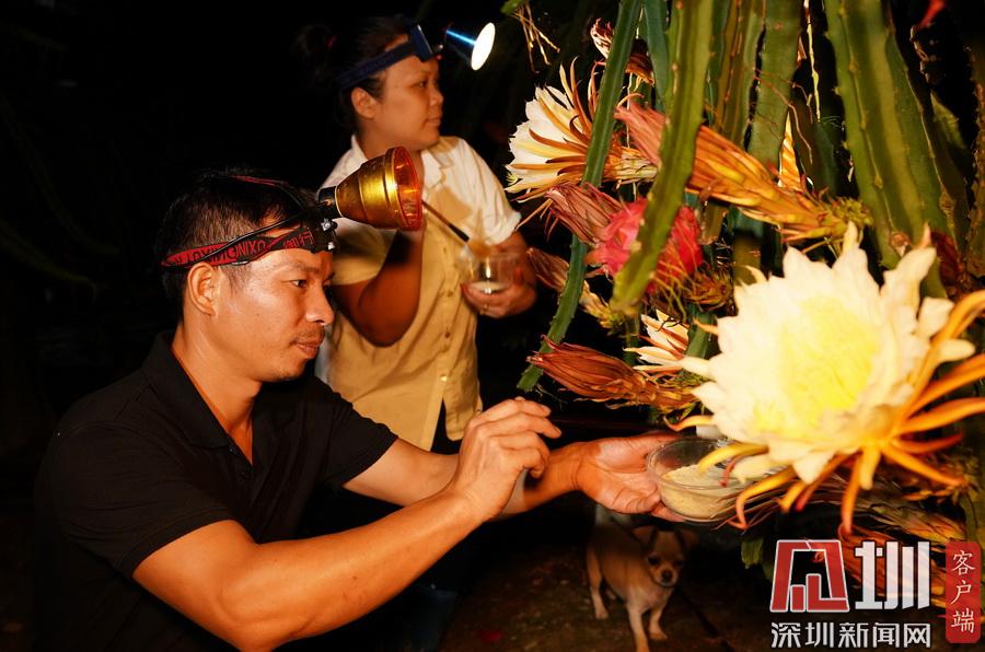 2020年7月14日晚,在廣西融水苗族自治縣融水鎮(zhèn)三合村黎鄧屯,兩名村民正在給紅心火龍果“點(diǎn)花”。