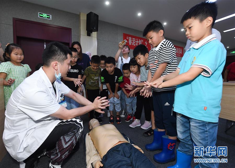 7月16日,東林鎮(zhèn)衛(wèi)生院的醫(yī)護(hù)人員(左一)在給學(xué)生們上應(yīng)急救護(hù)課。當(dāng)日,浙江省湖州市吳興區(qū)東林鎮(zhèn)舉辦暑期“安全防護(hù)小超人”主題活動(dòng)。活動(dòng)由醫(yī)護(hù)人員、消防隊(duì)員等為學(xué)生及家長(zhǎng)講授日常安全避險(xiǎn)及溺水急救知識(shí),中小學(xué)們還在現(xiàn)場(chǎng)學(xué)習(xí)了簡(jiǎn)易包扎、心肺復(fù)蘇的正確方式,并了解滅火器、滅火毯等消防器材的使用,為學(xué)生平安過(guò)暑期打好安全防護(hù)“預(yù)防針”。新華社記者 徐昱 攝
