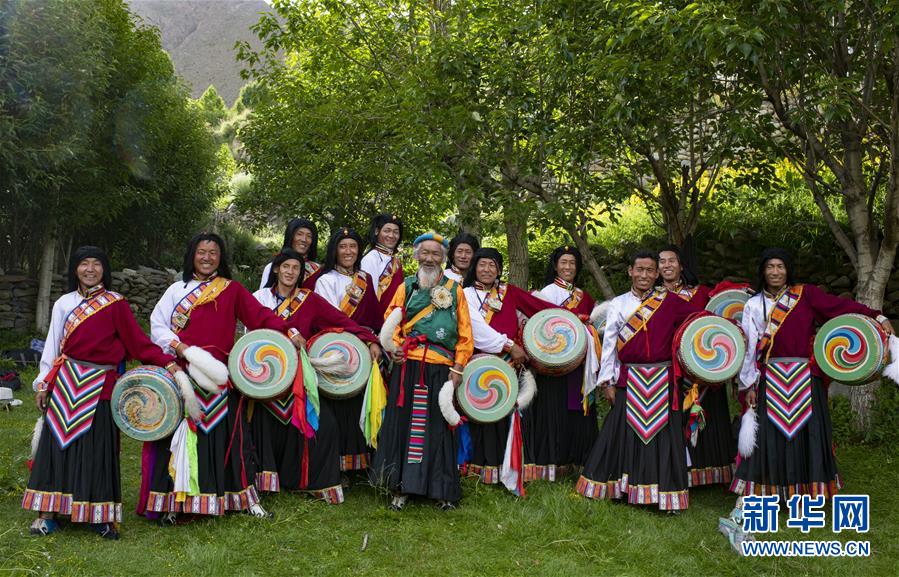 尼瑪(中)和弟子們正在表演“久河卓舞”(7月1日攝)。新華社記者普布扎西攝