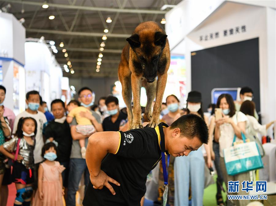 7月19日,在成都世紀(jì)城新國(guó)際會(huì)展中心,一家寵物學(xué)校的馴導(dǎo)師在表演馴犬。當(dāng)日,第九屆成都國(guó)際寵博會(huì)進(jìn)入最后一天。此次展會(huì)展出面積30000平方米,匯聚國(guó)內(nèi)外品牌企業(yè)和產(chǎn)品,覆蓋中西部地區(qū)寵物行業(yè)食品、用品、醫(yī)療和服務(wù)等領(lǐng)域。新華社記者王曦?cái)z