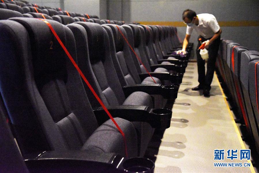 2020年7月19日,上海影城員工在放映廳里為座位消毒。當日,上海部分電影院為恢復開放營業(yè)進行最后階段準備。新華社記者任瓏攝