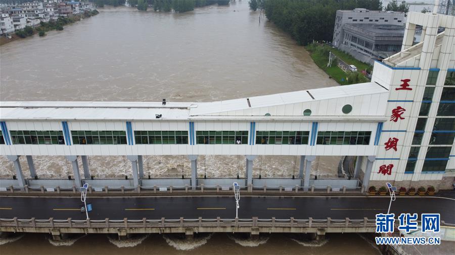 這是7月22日在安徽省阜南縣拍攝的淮河王家壩閘(無(wú)人機(jī)照片)。7月22日14時(shí),淮河王家壩水位降至28.73米,超警戒水位1.23米,低于保證水位0.57米。新華社記者張端攝