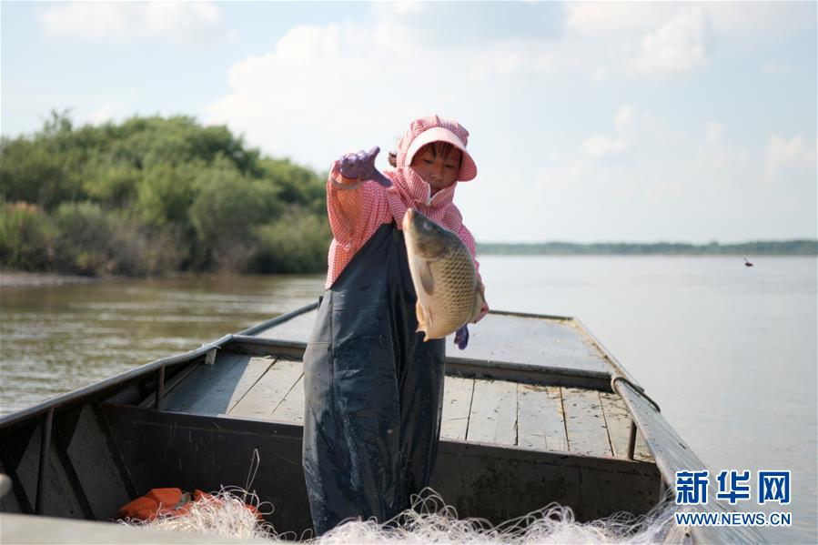7月22日,在二道江灘地,赫哲族村民劉洪海的妻子叢秀松把剛打上來(lái)的魚(yú)放進(jìn)船艙。新華社記者王建威攝