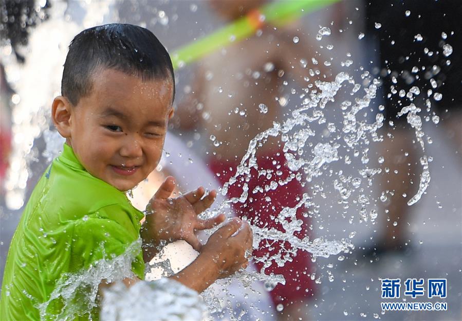 7月24日,一名小男孩在北京華熙LIVE·五棵松商業(yè)街區(qū)的一處噴泉戲水。北京市氣象局7月24日傍晚發(fā)布稱,24日截至16時(shí)30分,平原大部分地區(qū)出現(xiàn)37℃以上高溫天氣,局地氣溫超過40℃。北京市已于23日發(fā)布高溫藍(lán)色預(yù)警,預(yù)計(jì)25日全市大部分地區(qū)日最高氣溫仍將達(dá)35℃以上。新華社記者陳曄華攝
