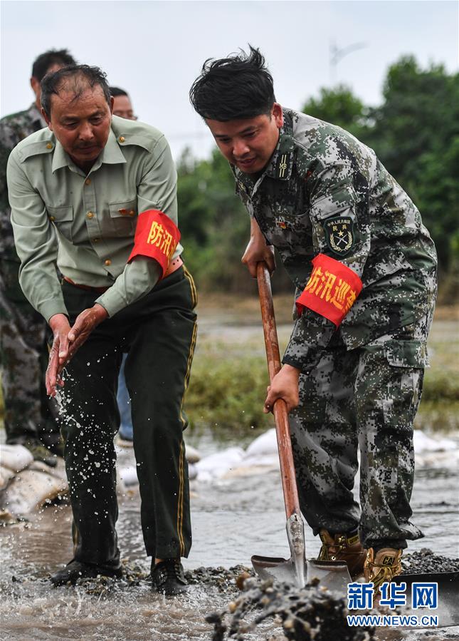 7月18日,陳申桃(左)和兒子在東升堤附近處理一起泡泉險情。新華社記者胡晨歡攝