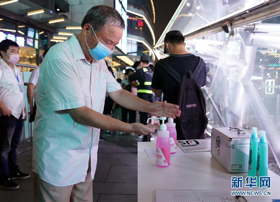 7月25日,在上海大寧音樂(lè)廣場(chǎng),觀看露天電影展映的觀眾在入場(chǎng)前清潔手部。新華社記者 劉穎 攝