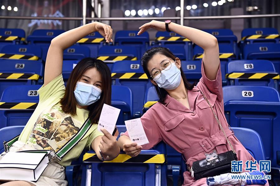 7月26日,在青島國信體育館,兩位現(xiàn)場觀看比賽的觀眾展示著自己的紙質球票。當日,在山東青島舉行的2019-2020賽季中國男子籃球職業(yè)聯(lián)賽(CBA)復賽第二階段(嶗山賽區(qū))比賽中,醫(yī)護人員、教師、公安戰(zhàn)線人士通過官方購票平臺,完成包括核酸檢測在內的相關流程后進場觀看了上海久事隊迎戰(zhàn)山東西王隊的比賽。觀賽期間,觀賽者須全程佩戴口罩,對號入座,嚴格保持間隔一米就座。退場時,觀眾須按照自后向前、先兩邊后中間的順序,保持“一米線”社交距離有序退場。新華社記者 郭緒 雷攝