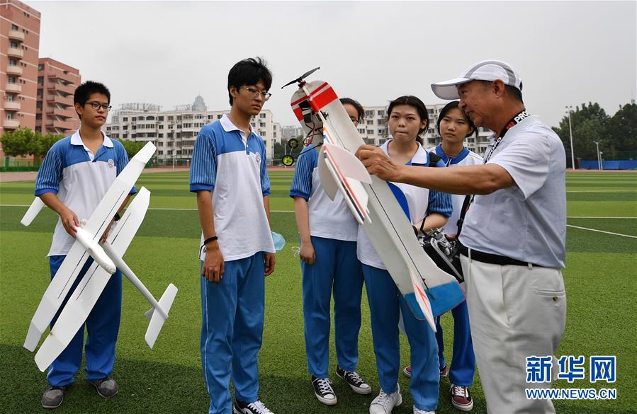 7月27日,老師在天津中學操場上給參加暑期實踐營的學生講解航模知識。新華社記者 李然 攝