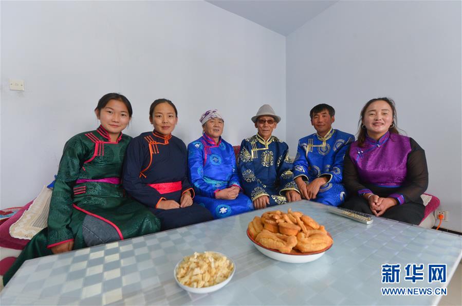 呼格吉勒一家在新房內(nèi)合影,從左至右分別為:女兒蘇日娜、妹妹阿榮高娃、母親烏云格日勒、父親孟克敖其爾、呼格吉勒、妻子薩如拉(7月26日攝)。新華社記者徐欽攝