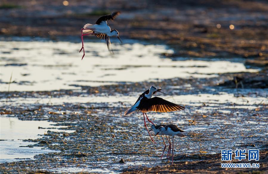 7月28日,在鄂爾多斯?jié)竦靥伊R—阿拉善灣海子,兩只長腳鷸在爭斗。鄂爾多斯?jié)竦匚挥趲觳箭R沙漠、毛烏素沙地接壤地帶,2002年被列入國際重要濕地名錄。從2006年開始,由于濕地湖面萎縮、湖心島消失,在此筑巢繁殖的世界瀕危物種遺鷗幾近消失。近年來,當地采取多種治理措施,濕地生態(tài)環(huán)境逐步好轉。2019年起,濕地內的桃力廟—阿拉善灣海子迎來遺鷗大規(guī)?!盎貧w”。如今,40多種鳥類在此棲息,鄂爾多斯?jié)竦刂匦鲁蔀轼B類的樂園。新華社記者連振攝