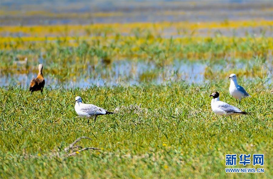 7月28日,灰雁和遺鷗在桃力廟—阿拉善灣海子覓食。鄂爾多斯?jié)竦匚挥趲觳箭R沙漠、毛烏素沙地接壤地帶,2002年被列入國際重要濕地名錄。從2006年開始,由于濕地湖面萎縮、湖心島消失,在此筑巢繁殖的世界瀕危物種遺鷗幾近消失。近年來,當地采取多種治理措施,濕地生態(tài)環(huán)境逐步好轉。2019年起,濕地內的桃力廟—阿拉善灣海子迎來遺鷗大規(guī)?!盎貧w”。如今,40多種鳥類在此棲息,鄂爾多斯?jié)竦刂匦鲁蔀轼B類的樂園。新華社記者彭源攝