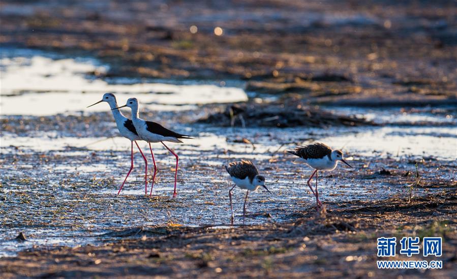 7月28日,兩只長腳鷸在桃力廟—阿拉善灣海子覓食。鄂爾多斯?jié)竦匚挥趲觳箭R沙漠、毛烏素沙地接壤地帶,2002年被列入國際重要濕地名錄。從2006年開始,由于濕地湖面萎縮、湖心島消失,在此筑巢繁殖的世界瀕危物種遺鷗幾近消失。近年來,當地采取多種治理措施,濕地生態(tài)環(huán)境逐步好轉。2019年起,濕地內的桃力廟—阿拉善灣海子迎來遺鷗大規(guī)模“回歸”。如今,40多種鳥類在此棲息,鄂爾多斯?jié)竦刂匦鲁蔀轼B類的樂園。新華社記者連振攝