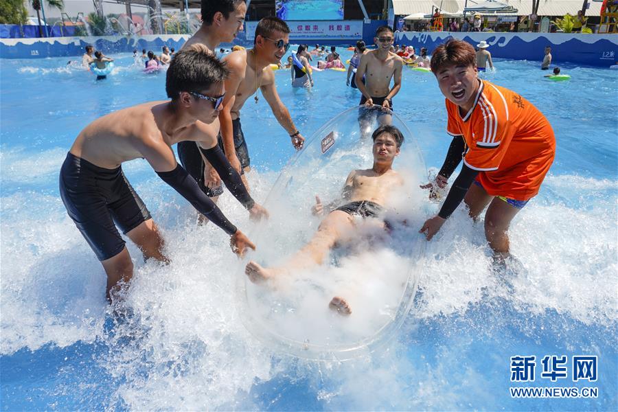 8月5日,重慶涪陵紅酒小鎮(zhèn)水上樂園內,一名游客用真冰做成的冰桶裝滿水,給自己澆水降溫。當日,重慶市氣象臺再次發(fā)布“高溫橙色預警信號”,重慶大部分海拔400米以下地區(qū)日最高氣溫將升至37℃以上,局地可達40℃以上。許多重慶市民涌進當?shù)氐乃蠘穲@和泳池,在水中享受夏季的清涼。新華社記者劉潺攝