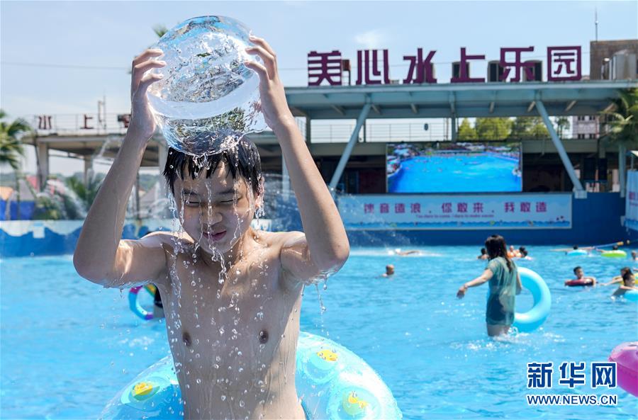 8月5日,重慶涪陵紅酒小鎮(zhèn)水上樂園內,市民在水中嬉戲。當日,重慶市氣象臺再次發(fā)布“高溫橙色預警信號”,重慶大部分海拔400米以下地區(qū)日最高氣溫將升至37℃以上,局地可達40℃以上。許多重慶市民涌進當?shù)氐乃蠘穲@和泳池,在水中享受夏季的清涼。新華社記者劉潺攝