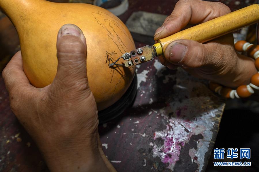 8月5日,侯景偉在葫蘆上進行創(chuàng)作。今年55歲的吉林四平人侯景偉自幼與家人學習雕刻、烙畫藝術。經過多年潛心研究,他將浮雕和烙畫工藝相結合,通過拋光、起稿、雕刻、烙燙、套色等十余道工藝,制作展現(xiàn)傳統(tǒng)文化、民俗故事的葫蘆工藝品。2020年,侯景偉被評為四平市非物質文化遺產項目侯氏葫蘆雕刻烙畫代表性傳承人。他說:“希望有更多人加入到非遺傳承隊伍中,讓小葫蘆‘講’出更多民俗故事?!毙氯A社記者張楠攝