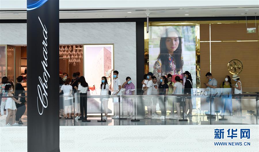 8月6日,游客在三亞國際免稅城排隊進(jìn)店。新華社記者楊冠宇攝