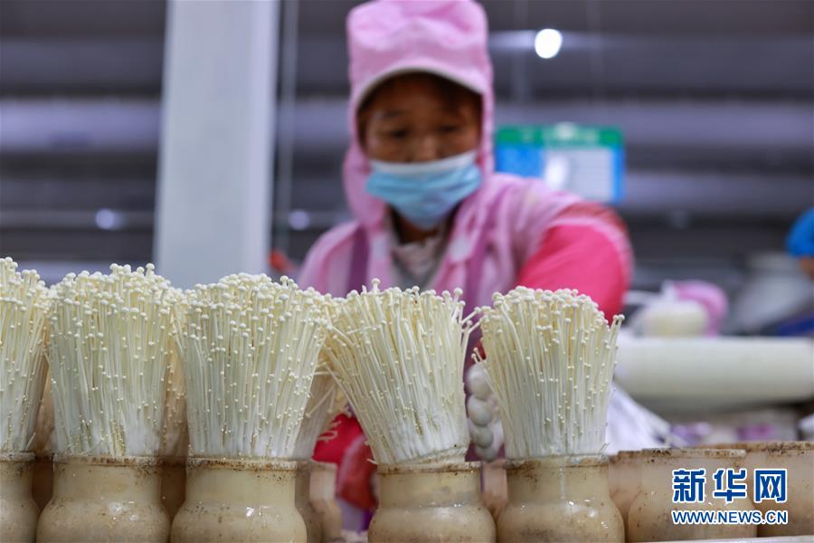 8月6日,工作人員在威寧雪榕生物科技有限公司包裝金針菇。新華社記者劉續(xù)攝