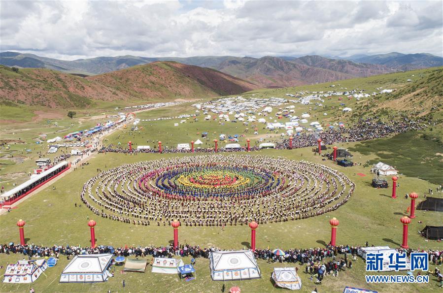 西藏首屆弦子舞展演現(xiàn)場(8月7日攝,無人機照片)。當日,西藏首屆弦子舞展演在昌都市芒康縣舉行。眾多演員同臺獻藝,表演國家級非物質文化遺產(chǎn)弦子舞,吸引西藏各地的群眾前來觀看。新華社記者孫非攝