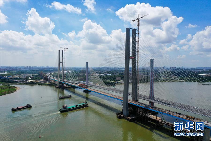 8月9日拍攝的廣州南沙港鐵路跨西江特大斜拉橋最后一塊鋼箱梁吊裝施工現(xiàn)場(無人機(jī)照片)。當(dāng)日,中鐵十一局承建的粵港澳大灣區(qū)基礎(chǔ)設(shè)施“硬聯(lián)通”重點工程——廣州南沙港鐵路跨西江特大斜拉橋完成最后一塊鋼箱梁吊裝作業(yè),大橋即將合龍。該橋位于廣東佛山市和江門市交界處,全長1117.5米。新華社記者劉大偉攝。