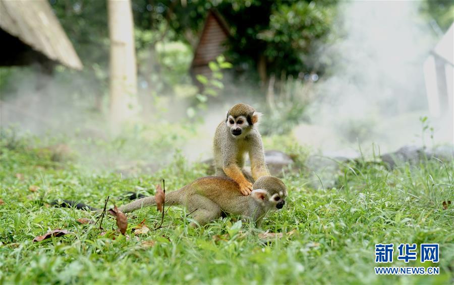 8月11日,上海動(dòng)物園的松鼠猴在“地噴”營造的水霧中玩耍。當(dāng)日,上海最高溫度達(dá)到35攝氏度,上海動(dòng)物園開啟園內(nèi)安裝的各種噴淋裝置,讓動(dòng)物們防暑降溫,樂享清涼。新華社記者張建松攝