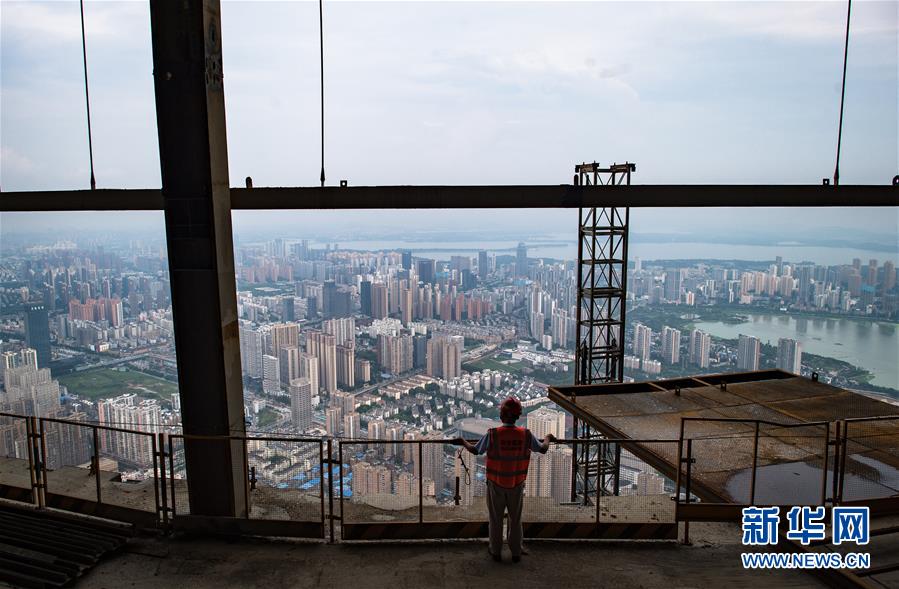 8月11日,一名工人在武漢綠地中心項(xiàng)目建設(shè)現(xiàn)場(chǎng)近500米的高空遠(yuǎn)眺。新華社記者肖藝九攝