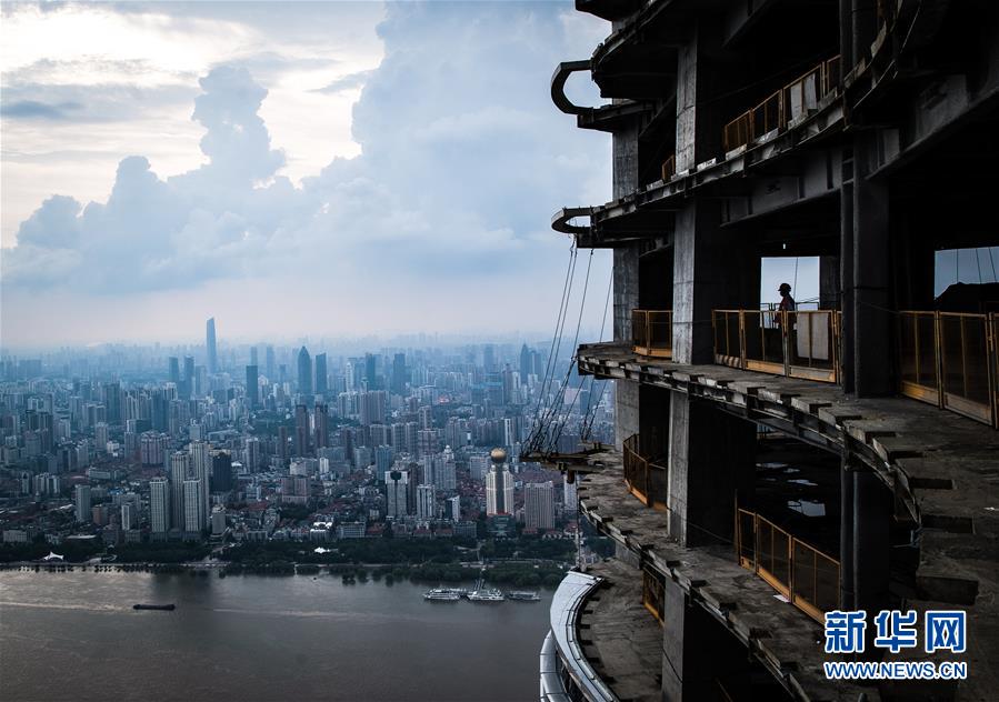 8月11日,一名工人在武漢綠地中心項目建設(shè)現(xiàn)場近500米的高空遠(yuǎn)眺。新華社記者肖藝九攝