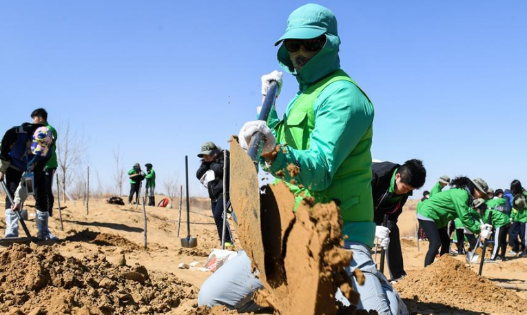 當日,200余名中韓兩國青年志愿者來到內(nèi)蒙古自治區(qū)達拉特旗庫布其沙漠種樹。