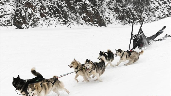 當(dāng)?shù)貢r(shí)間3月4日,俄羅斯克拉斯諾亞爾斯克,當(dāng)?shù)嘏e行10公里狗拉雪橇比賽。