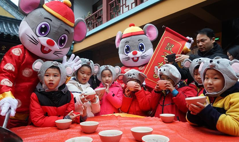 1月2日,小朋友在南京玄奘寺的贈粥送祝?;顒蝇F(xiàn)場喝臘八粥。 當日是農(nóng)歷臘月初八,中國傳統(tǒng)臘八節(jié)。