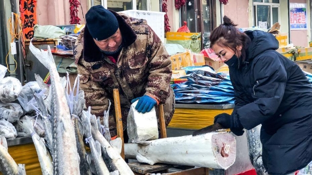 寒冬臘月是黑龍江撫遠(yuǎn)的凍魚銷售旺季。讓人大開眼界的是,一二百斤大魚得鋸開了賣;最讓魚販子開心的是,最多一天進賬5萬元。