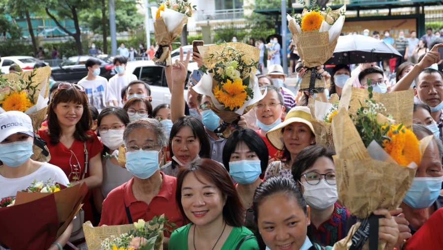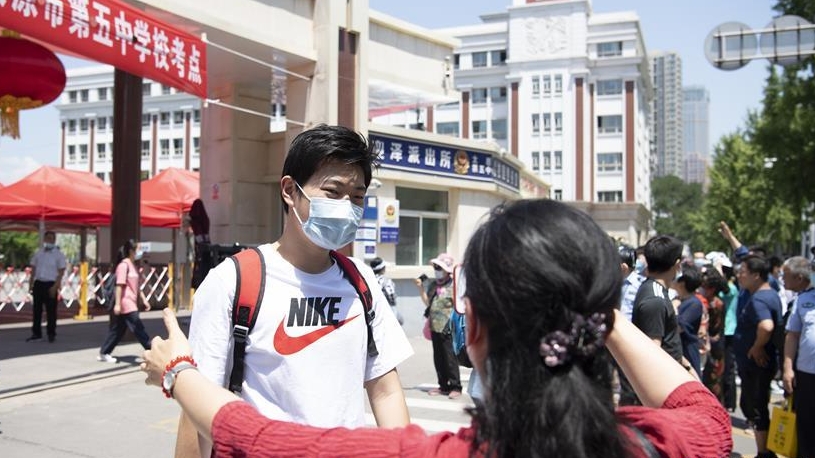 7月7日,在山西省太原市第五中學(xué)??键c(diǎn),結(jié)束首場(chǎng)科目考試的考生走出考場(chǎng)。