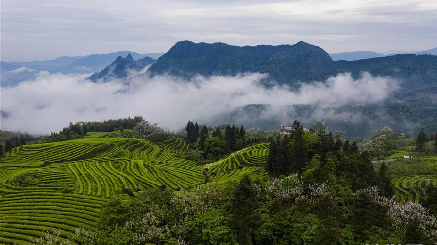 四川省珙縣的鹿鳴茶海,常年云霧繚繞,茶壟依山分布,美不勝收。