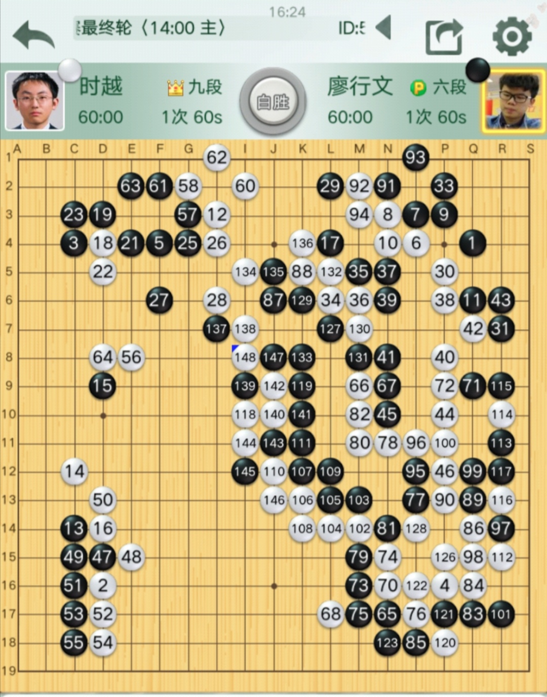 時越自評:序盤階段正常,黑棋率先在上邊打入挑起戰(zhàn)斗,中盤黑棋判斷失誤,之后形成轉換,白棋確立勝勢。