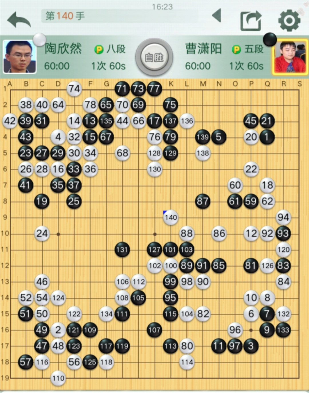 陶欣然自評:布局階段至44的轉換差不多。黑63動出至79收獲不大,白方確立優(yōu)勢。白116吃住左下角后領先不少了。