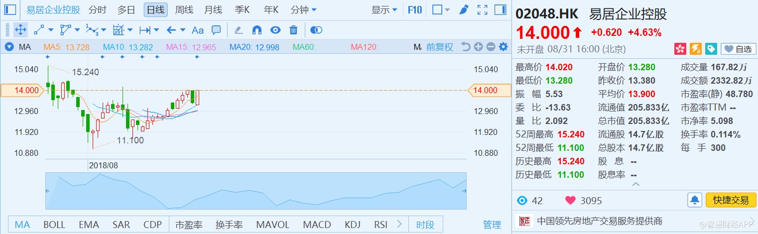 中國房地產(chǎn)行業(yè)正站在拐點(diǎn)上,行業(yè)集中度將進(jìn)一步提升,存量市場成為各路資本的新戰(zhàn)場,“服務(wù)生”易居在資源及戰(zhàn)略布局上已做好充分準(zhǔn)備,上半年的成績或許只是新的起點(diǎn)。8月31日,易居股價收漲4.63%,報14港元。