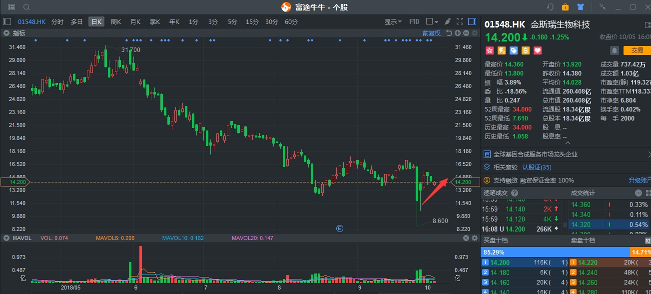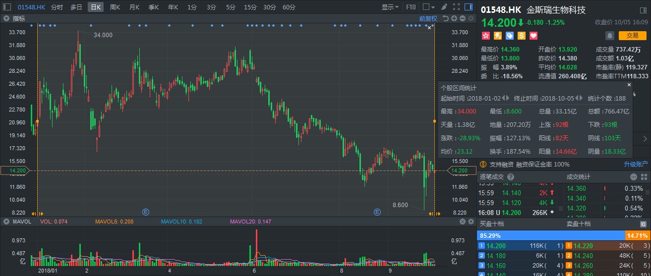 談及去年的港股牛市,金斯瑞應該算得上是生物醫(yī)藥板塊中,非常引人注目的一只股票。就算2018年隨大市回調(diào),但表現(xiàn)仍可圈可點:受益港股通北水資金利好,成交量異?;钴S,成交量平均每日達到2000萬股,總額平均4.08億港元。細數(shù)港股通標的,有如此活躍成交量的股票確實不多。