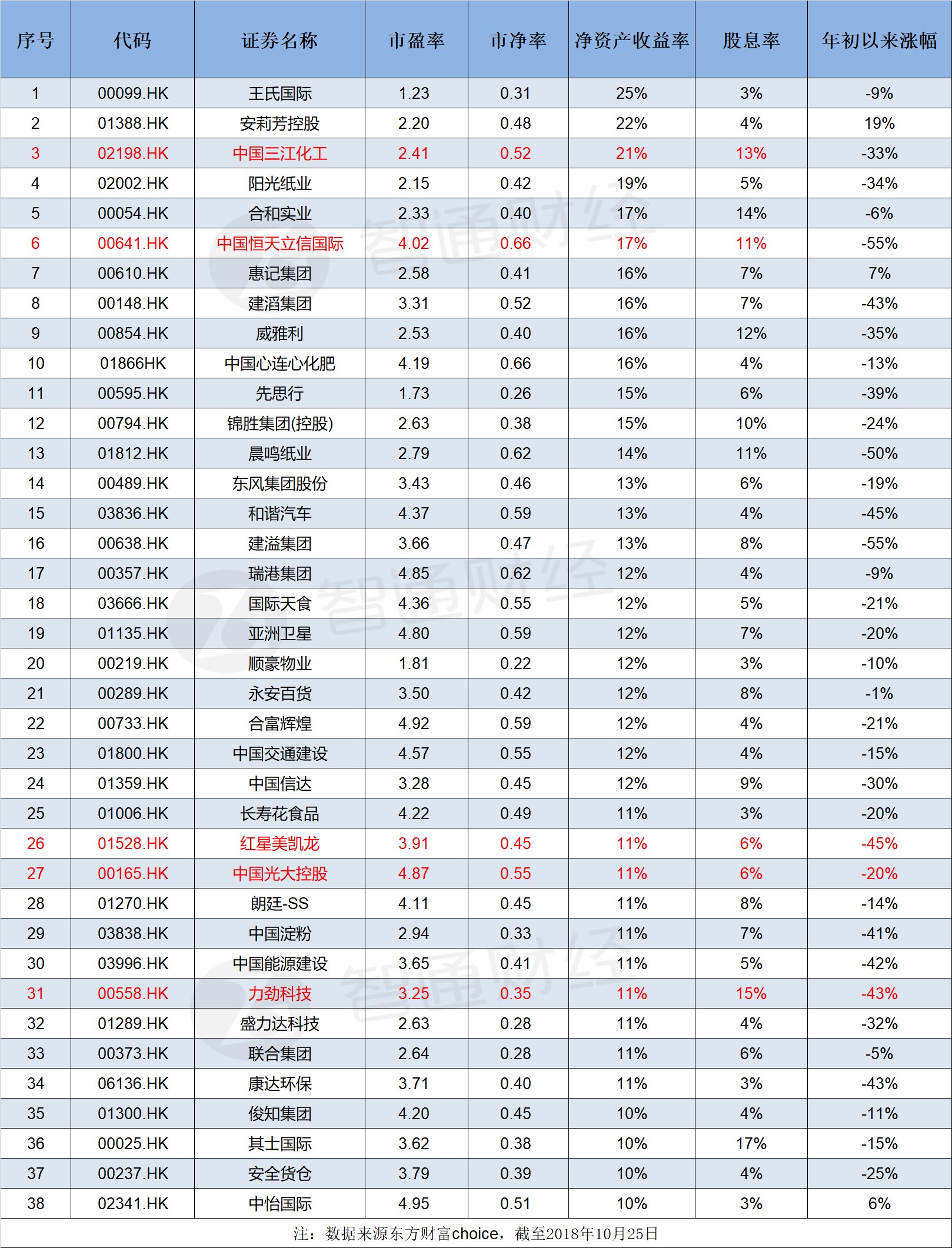 圖表顯示,截止2018年10月25日,從ROE指標(biāo)來看,指標(biāo)比較居前的公司有安莉芳(01388)、中國三江化工(02198)、合和實業(yè)(00054)。其中,中國三江化工為ROE及股息率雙高個股。
