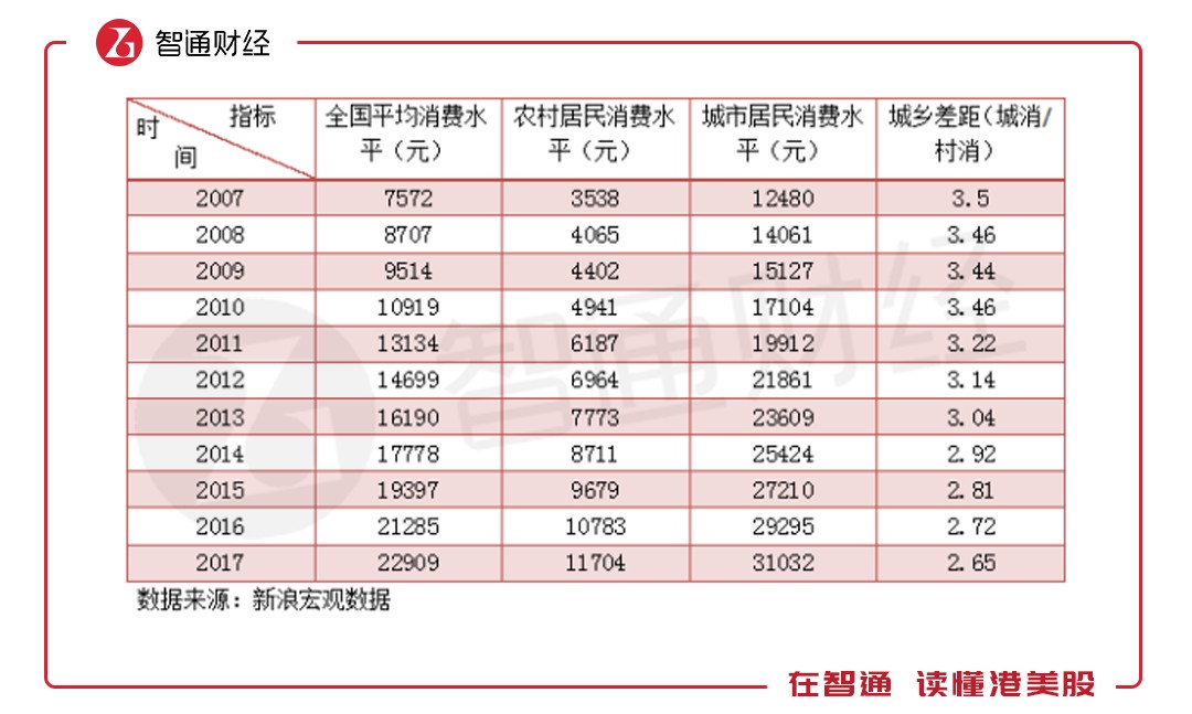 考慮到消費(fèi)能力的變化,根據(jù)新浪宏觀數(shù)據(jù),2008年農(nóng)村的消費(fèi)水平為4065元,而城市為14061元,城鄉(xiāng)差距3.46倍,不過(guò)城鄉(xiāng)差距慢慢降低了,到2017年為2.65倍,彼時(shí)農(nóng)村消費(fèi)水平為11704元,但仍偏低,相當(dāng)于城市2007年的水平。