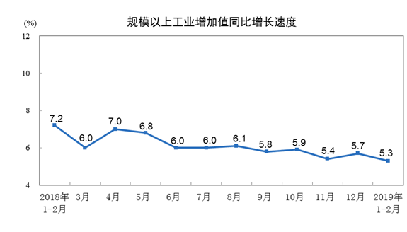 智通財經APP獲悉,國家統(tǒng)計局今日公布,2019年1-2月份,規(guī)模以上工業(yè)增加值同比實際增長5.3%(以下增加值增速均為扣除價格因素的實際增長率),預期增長5.6%,前值為6.2%。據(jù)測算,剔除春節(jié)因素影響增長6.1%。從環(huán)比看,2月份,規(guī)模以上工業(yè)增加值比上月增長0.43%。