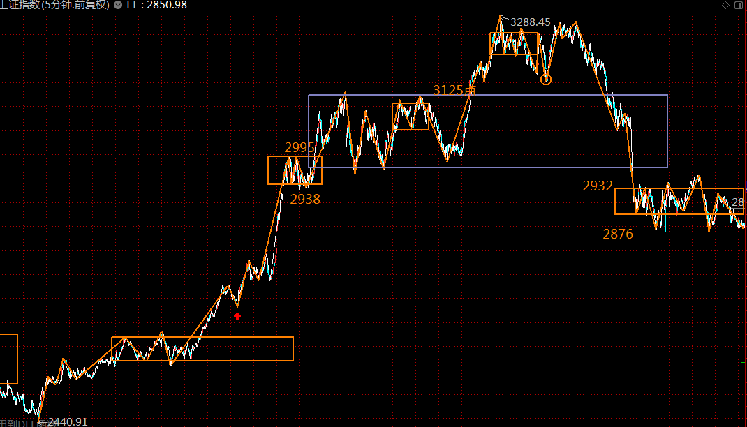 下圖為上證指數(shù)五分鐘級別走勢結(jié)構(gòu),第三類賣點已過,第一類買點正在構(gòu)建中,預(yù)計最差的情況,周一周二即可走完這波調(diào)整走勢,第一目標回補上方3050處的貿(mào)易戰(zhàn)缺口。