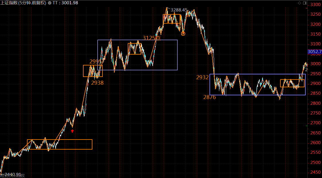 下圖為上證指數(shù)五分鐘級別走勢結構。目前已正式突破5月6日開始構建的三十分鐘中樞,目前在5分鐘的上漲趨勢中,未有結束的征兆,投資者宜全力做多,直至出現(xiàn)五分鐘上漲趨勢背馳為止,按壓力位看,大約在3050點附近。風險控制線2932點。