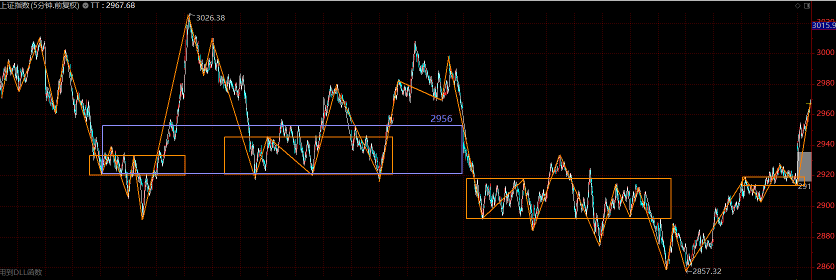 上周市場用前四天的時間,完成了這一輪五分鐘上漲趨勢的第一個中樞構(gòu)建,是一個奔走型的中樞,隨后在周五開始了主升階段。值得欣喜的是,市場終于在2956這個大關(guān)口放量了,并且一舉突破,預(yù)計在2956到3000點這40點的空間內(nèi),市場將會完成五分鐘上漲第二個中樞的構(gòu)建,并且橫盤將其擴展為30分鐘級別,時間周期大約是極點出現(xiàn)后的10到15個交易日。這將是投資者積極調(diào)倉換股,耐心布局年報行情的最佳時期。