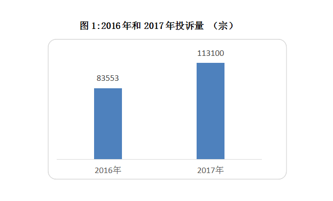 2017年,深圳市、區(qū)消委會共接受消費(fèi)者投訴113100宗,比2016年的83553宗增長了35.36%。“315消費(fèi)通”系統(tǒng)來源投訴65065宗占比58%,12315電話來源投訴45888宗占比41%,可見“315消費(fèi)通”系統(tǒng)已經(jīng)成為消費(fèi)者投訴主要方式。