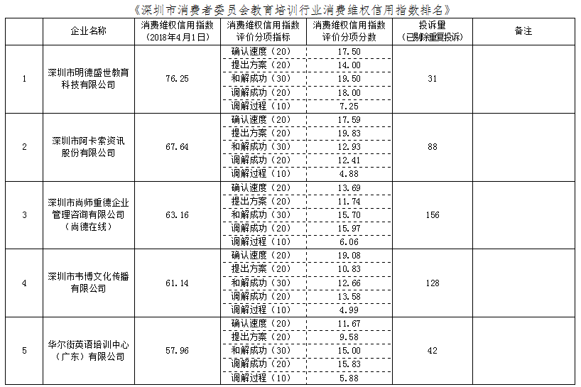 在本次公布的教育培訓行業(yè)消費維權信用指數(shù)排名中,深圳市明德盛世教育科技有限公司的消費維權信用指數(shù)為76.25,排名第一,其2017年4月1日至2018年3月31日期間的投訴量為31宗;坤澤教育(深圳)有限公司的消費維權信用指數(shù)為14.24,排名第十,其2017年4月1日至2018年3月31日期間的投訴量為42宗。
