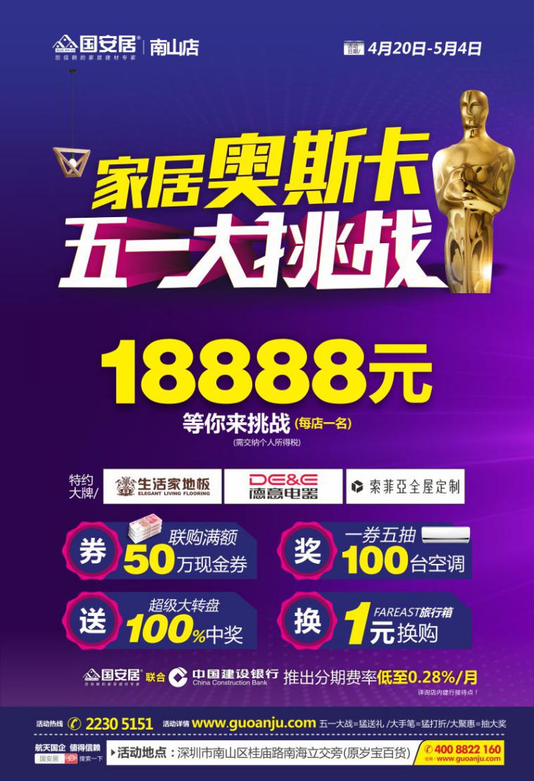4月20號~5月4號,南山國安居家居奧斯卡五一大挑戰(zhàn)盛大開啟,一大波福利和超值優(yōu)惠來襲,準備好接招了嗎?