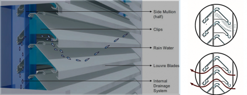 除了屋面幕墻的“防水神經(jīng)系統(tǒng)”,令人驚嘆的還有安裝在展館立面幕墻上的“人字形”百葉,這種雙片百葉同時具備50%“空氣通風性能和95%防雨水性能。巧妙的“人字形”設計,使得風和雨水從百葉片間進入時,能夠保證空氣從向上傾斜的第一片百葉有效進入,而雨水被第二片向下傾斜的百葉擋住,并由葉片分流至兩邊的豎框里,排出下邊框?!叭俗中巍卑偃~不僅能完全阻風防雨,還具備超高強度,足以抵抗臺風暴雨的侵襲。