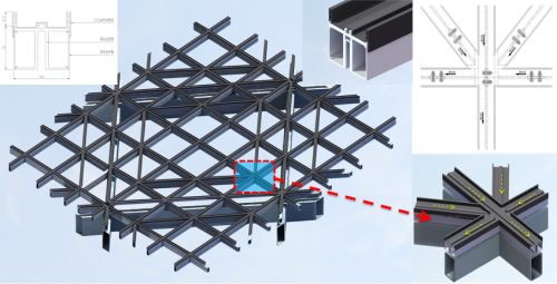 由于每一個小“盒子”的顏色都是獨一無二的,需要在生產(chǎn)階段為每一塊零件編號,并在安裝時按編號一塊一塊進行組合。更讓項目部犯難的是,在根據(jù)原有方案進行樣板安裝時,“盒子”全部下垂,原因是菱形盒子突出內(nèi)層幕墻1米,難以固定支撐。后經(jīng)反復研究試驗,決定在裝盒子前,在墻上做一個外觀似蜘蛛網(wǎng)的控制體系,為每個菱形盒子準確定位,將安裝精度控制在毫米級。